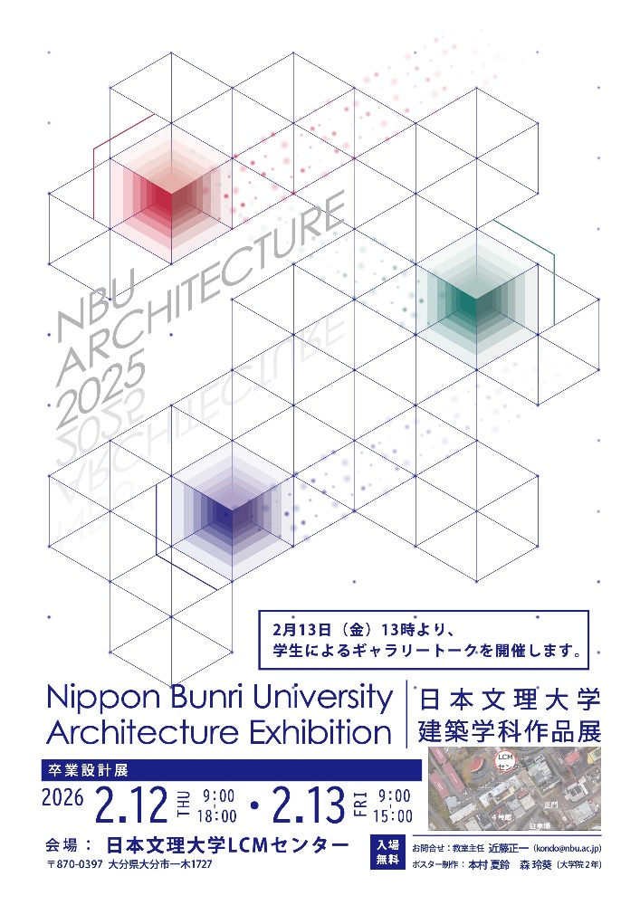 催しの情報(九州) (過去のイベントもそのまま掲載してあります。) 2026年2月7〜8日・12〜13日開催「日本文理大学建築学科作品展」 2025年10月4日開催「熊本県立大学公開講演会「原田真紀氏講演会」」 2025年2月12〜14日開催「髙橋研究室卒業設計作品展」 2025年2月9・11日・15〜16日開催「日本文理大学建築学科作品展」 2024年10月5日開催「熊本県立大学公開講演会「三木順子氏講演会」」 2024年5月18日開催「光浦高史氏講演会「土地の力を呼び起こす空間づくり」(オンデマンド視聴可)」 2024年2月13〜15日開催「髙橋研究室卒業設計作品展」 2024年2月10〜11日・17〜18日・24〜25日開催「日本文理大学建築学科作品展」 2023年11月19日開催「熊本県立大学公開講演会「建築家 西山英夫氏講演会」」 2023年10月20〜11月19日開催「おおいたの「推し」の建築展 -磯崎新と大分のまちづくり-」 2023年3月14〜16日開催「日本文理大学卒業設計展」 日本文理大学卒業設計展ポスター 2023年2月13〜15日開催「髙橋研究室卒業設計作品展」 髙橋研究室卒業設計作品展ポスター 戻る